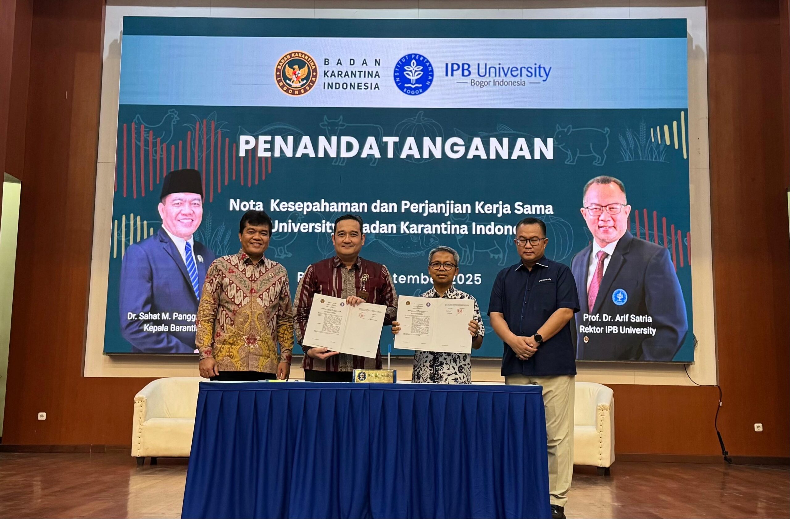 Rangkaian kegiatan kemudian dilanjutkan dengan penandatanganan Nota Kesepahaman (MoU) dan Perjanjian Kerja Sama (PKS) antara Badan Karantina Indonesia (Barantin) dengan IPB University. Penandatanganan dilakukan oleh Sekretaris Utama Barantin, Shahandra Hanitiyo S.IP, M.Si, bersama Prof. Deni Noviana, Wakil Rektor Bidang Pendidikan dan Kemahasiswaan IPB University, yang mewakili IPB sebagai pihak kedua.